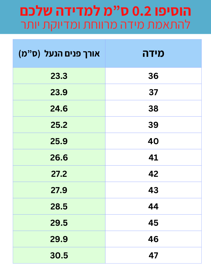 טבלת המידות היא הדרך הכי טובה לדעת את המידה המתאימה לכם, בדרכ הנעליים יתאימו למידה שלכם בנעליים רגילות, אם תרצו לדייק את המדידה תוכלו להיעזר בטבלת המידות שנמצאת מתחת לבחירת המידות של כל דגם