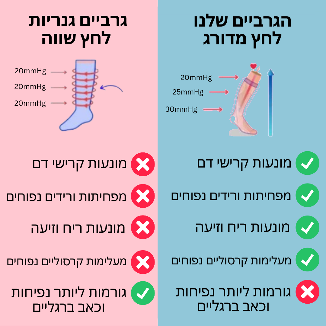 לחץ חזק יותר בקרסול ונחלש כלפי מעלה, מעודד זרימת דם תקינה ומפחית נפיחות.